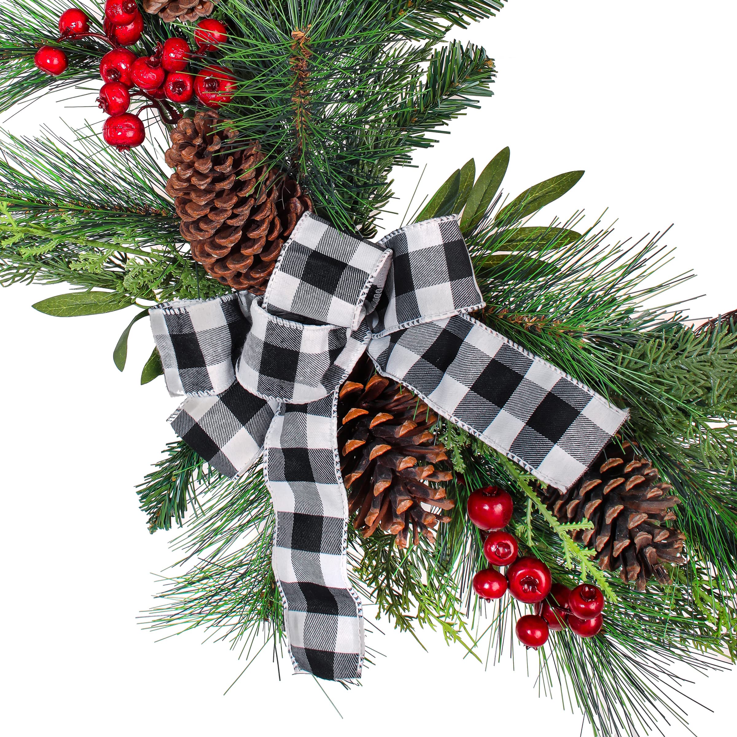 National Tree Company Artificial Christmas Mixed Pine and Berries Wreath, Decorated with Red Berries, Pinecones, and Black & White Plaid Bow, Bristle Branch Tips, 24 in—