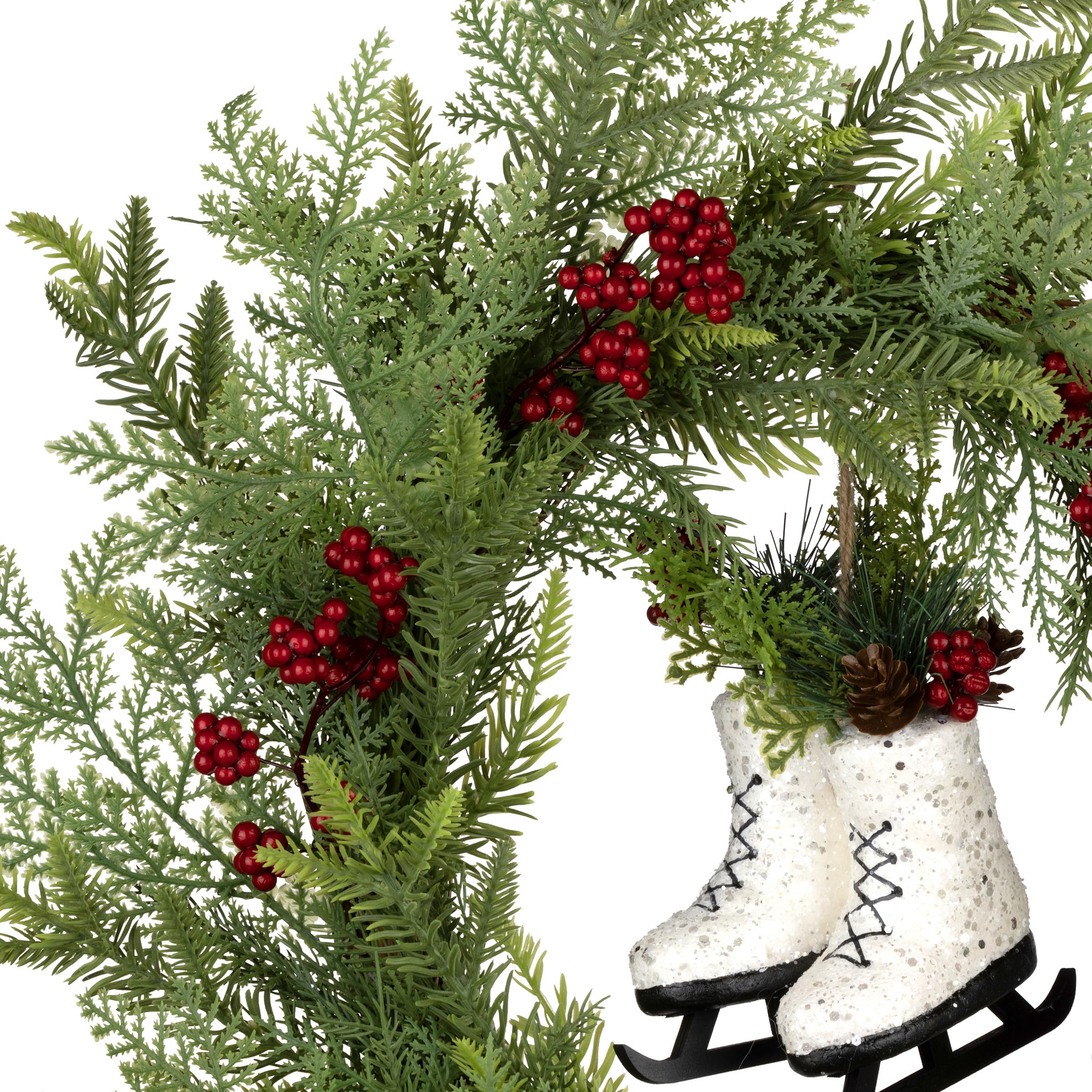 - Crafted with green branches and Pre-decorated with red berries and white skates.