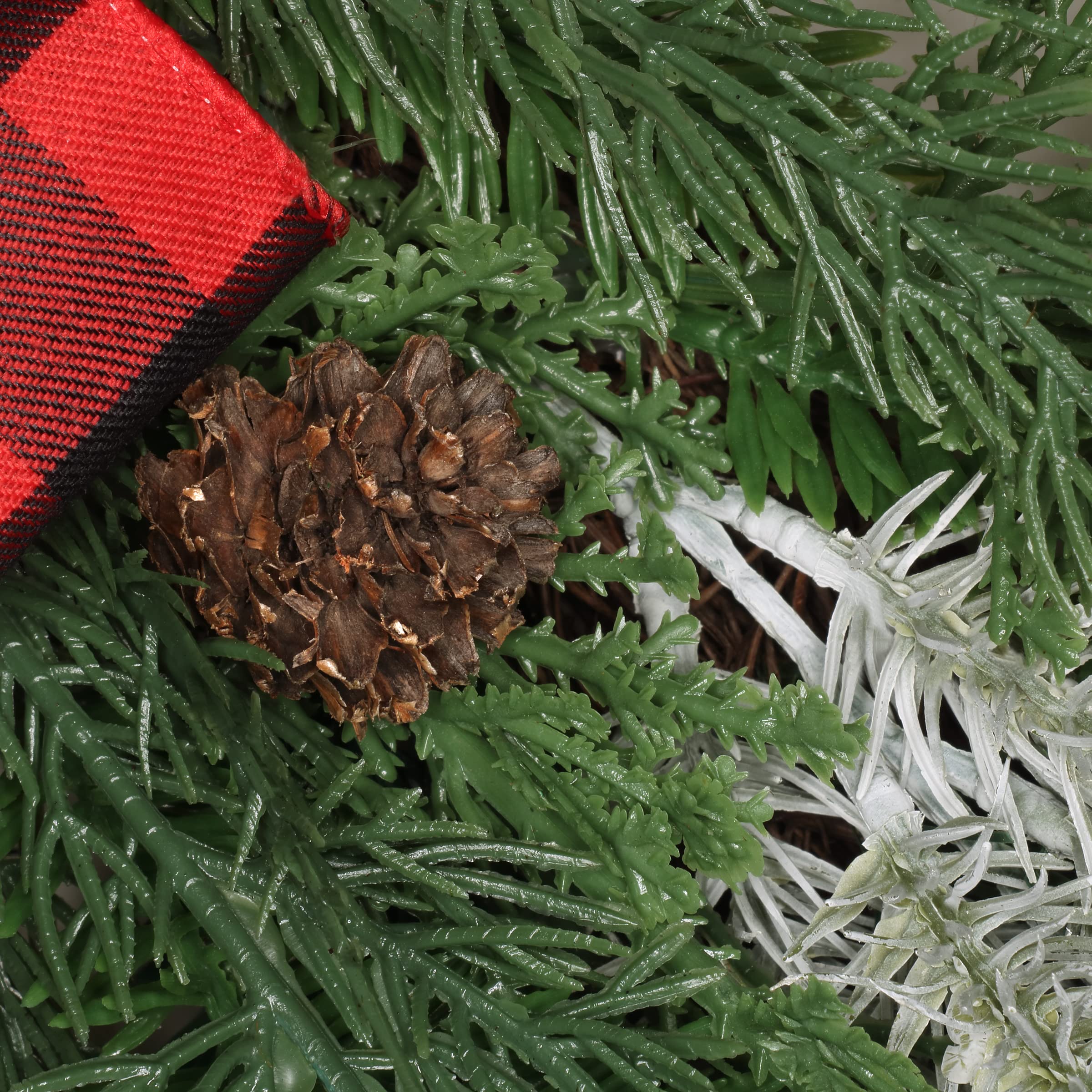 - This fantastically festive wreath features evergreen and long-steam leafy greens bursting from a woven branch ring, trimmed with mini pinecones and a black and red plaid ribbon and bow