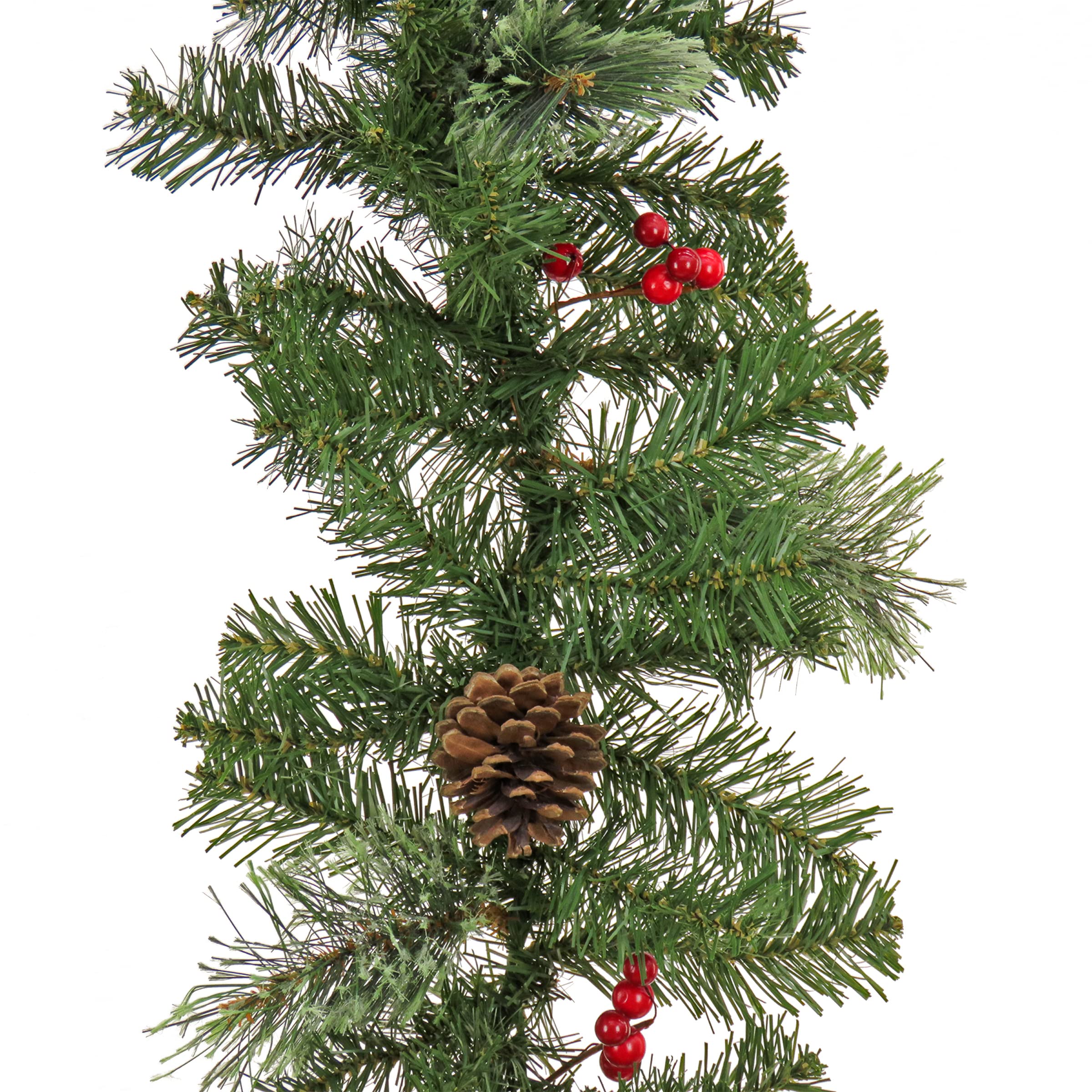- Includes one evergreen and cashmere tips garland trimmed with pinecones and red berries with 180 branch tips, measuring 9 ft. long with 10" diameter